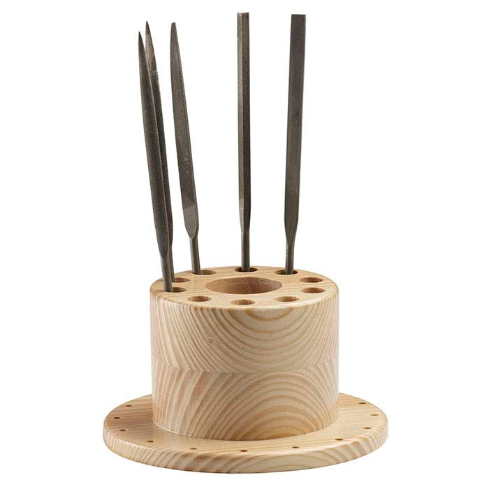 Keep your files, burs, polishing wheels and other small or slender tools more organized and easily within reach with this hardwood benchtop organizer. The main body of the organizer features a roomy center hole (1-3/8" diameter) and ten smaller holes (7/16" diameter) that are ideal for tweezers, files and other long, slender tools. The base offers 36 shank-sized holes (1/8" diameter) spaced around the entire base; these holes are ideal for burs, drills, brushes, wheels and discs. This hardwood has rounded edges and a smooth, light finish; offers 43 total openings to hold and organize tools.
