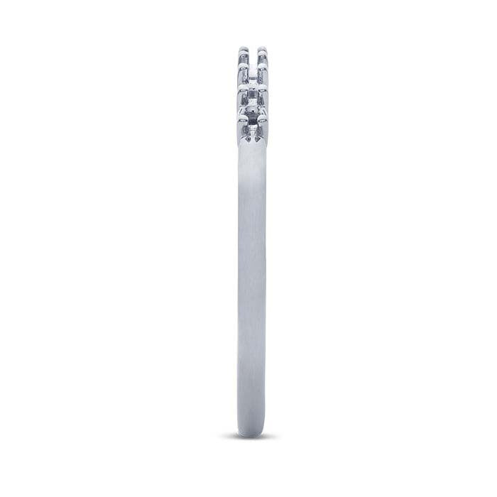 With a classic style, this platinum ring mounting has seven 4-prong basket settings that each hold a 3mm (0.1 ct., approx.) round faceted gemstone. The basket setting features open sides designed to allow more light to reach and move through the stone, enhancing its brightness and brilliance. Cut a seat in the prongs to accommodate your stone, then burnish the prongs over the stone to secure it in place.