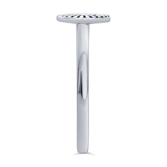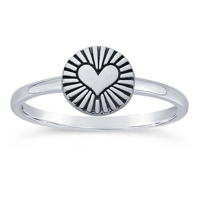 This sterling silver ring features a brightly-finished heart that surrounded with radiating rays of light, oxidized to accentuate the details. This ring is attractive as a stand-alone accessory or stacked in combination with other rings. Offer customers a variety of stackable ring styles to mix and match, and encourage them to create their own changeable designs.