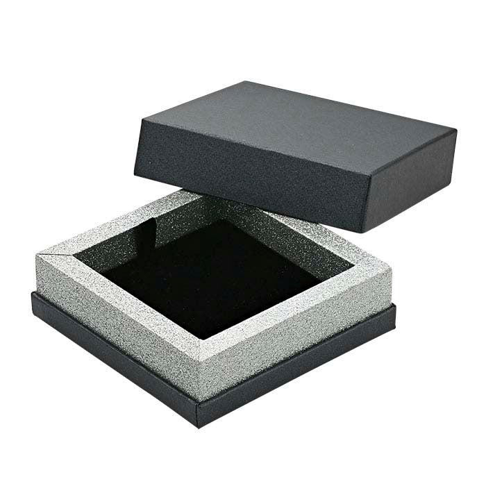 تتسع علبة الهدايا المصنوعة من الخشب والورق هذه لتعليق واحد أو زوج واحد من الأقراط. تصميم هذه العلبة ذات الجزأين يخلق مظهرًا ثنائي اللون متباينًا مع أوراق معدنية ومتألقة متناقضة. يغطي الورق المطفأ الملمس بلون رمادي أنثراسيت معدني عميق الجزء العلوي والسفلي من علبة الكرتون. يدعم الجزء السفلي من العلبة إطار خشبي داخلي مغطى بورق فضي لامع وملموس؛ ويتميز داخل العلبة بوسادة مخملية سوداء.