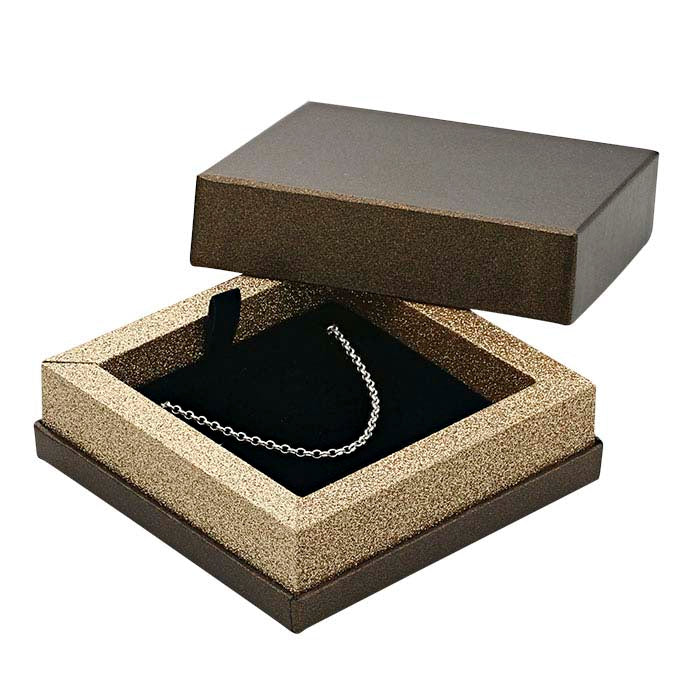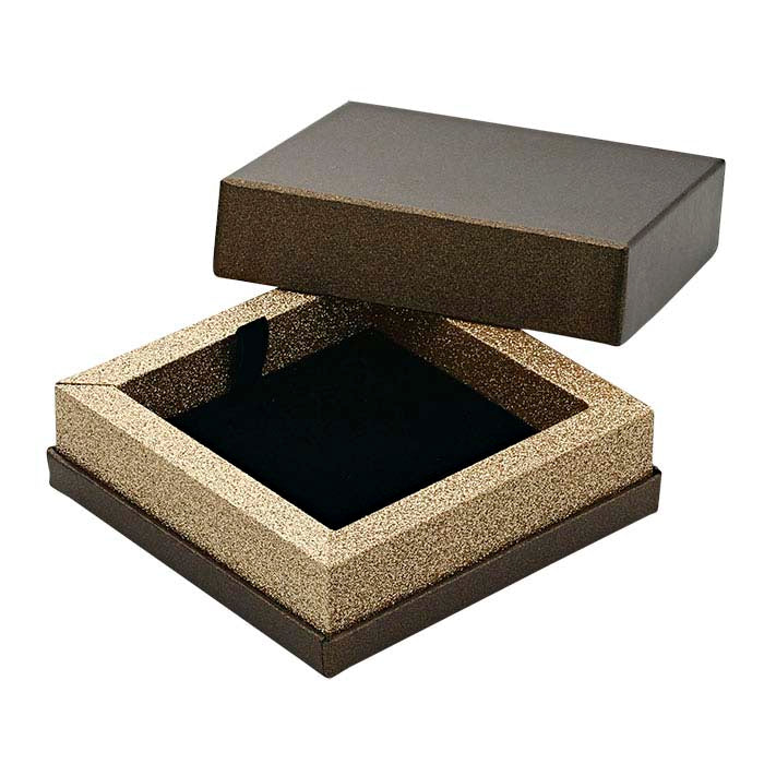 تتسع هذه العلبة المصنوعة من الخشب والورق لهدية واحدة من القلائد أو زوج واحد من الأقراط. تصميم هذه العلبة المكونة من جزأين يخلق مظهرًا ثنائي اللون متباينًا باستخدام أوراق معدنية وبراقة متناقضة. يغطي الورق المطفأ الملمس بلون برونزي معدني غني الجزء العلوي والسفلي من علبة الكرتون. يدعم الجزء السفلي من العلبة إطار خشبي داخلي مغطى بورق لامع ذهبي الملمس؛ ويحتوي داخل العلبة على وسادة مخملية سوداء.
