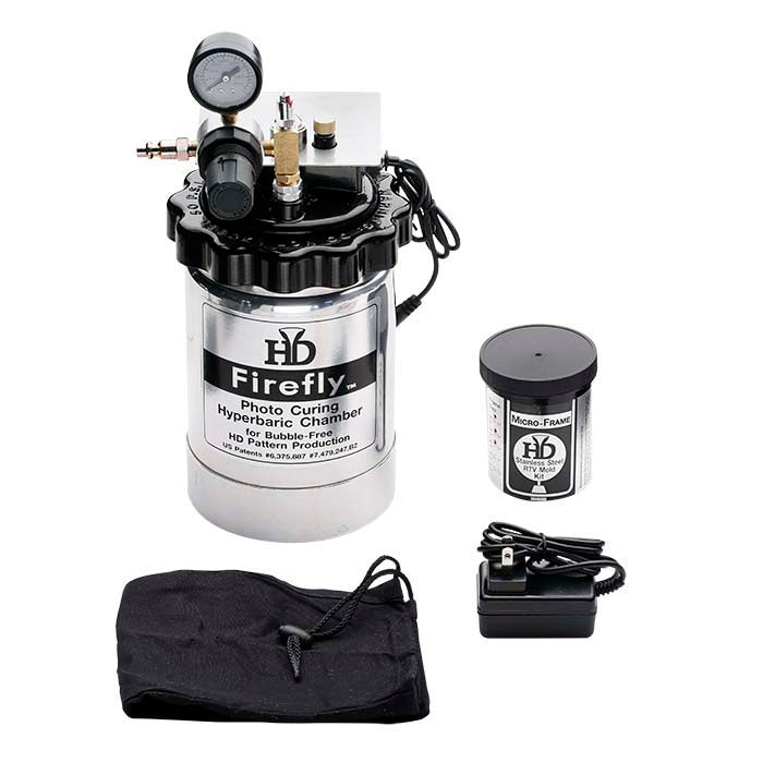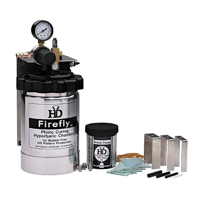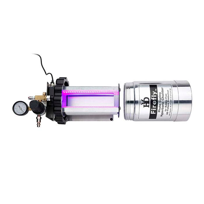مجموعة حجرة المعالجة بالأشعة فوق البنفسجية Firefly™ من HD Pattern مثالية لمعالجة أنماط القوالب المحقونة بالفوتوبوليمر Avatar بسرعة باستخدام ضوء الأشعة فوق البنفسجية والضغط العالي (مطلوب ضاغط هواء؛ متوفر بشكل منفصل). تستوعب الحجرة نفسها ما يصل إلى أربعة قوالب محقونة في وقت واحد، وتعالجها في حوالي 6 دقائق (في المتوسط)؛ ويتضمن ذلك مؤقتًا عمليًا. تُعالج القوالب باستخدام مزيج من ضوء الأشعة فوق البنفسجية والحرارة الناتجة عن مصابيح LED فوق البنفسجية. في بداية دورة المعالجة، يُطبق الضغط العالي (ويُحافظ عليه طوال الدورة) لإزالة الفقاعات من النمط (الأنماط)، مما يساعد على منع العيوب التي تسببها. ثم تُشغل أضواء الأشعة فوق البنفسجية للنصف الثاني من الدورة لتصلب ومعالجة النمط (الأنماط).