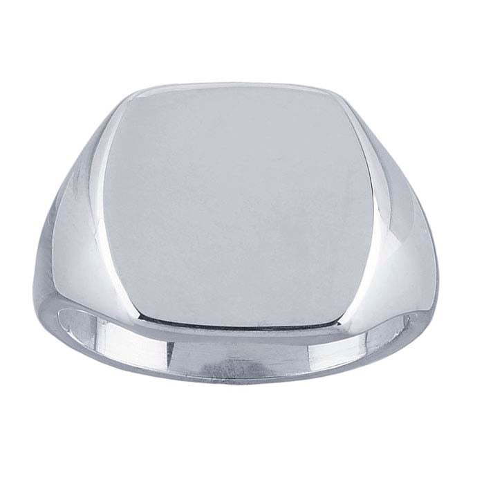 This sterling silver signet ring features an engravable 15 x 14mm cushion signet ideal for customizing the ring with a monogram, initials, or other decorative design. The signet on this ring is solid.Signet rings carry a history that goes back thousands of years to a time when a signet bore the mark of authority or conveyed status and was used in place of a handwritten signature. Today, a signet ring still conveys symbols unique to its wearer and makes an ideal gift to mark special accomplishments or achievement.