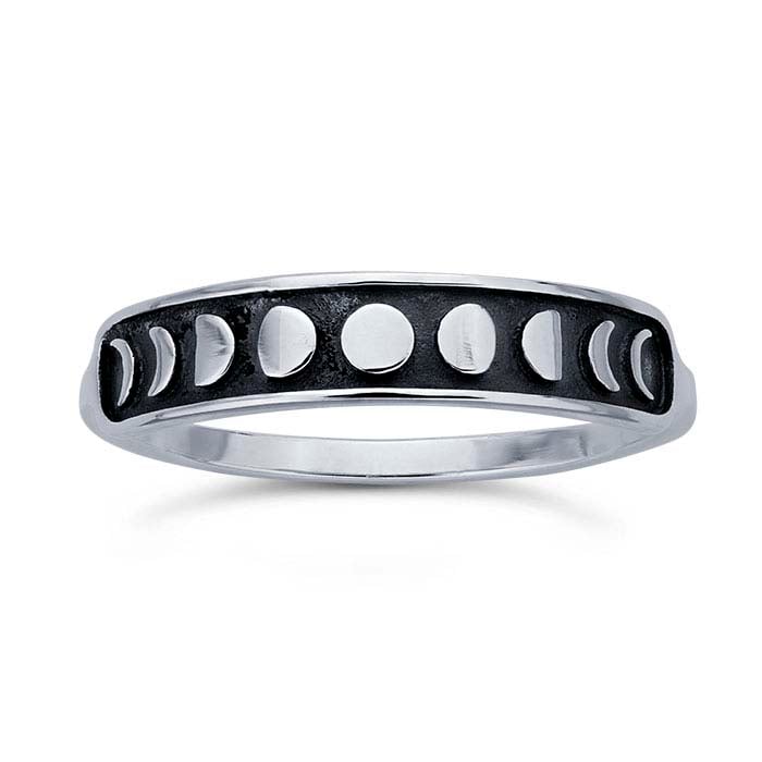 يتميز هذا الخاتم المصنوع من الفضة الإسترلينية بتسعة أقمار مصقولة بسطوع، تظهر في مراحل التزايد، البدر، والتناقص. تم تثبيتها في قناة مؤكسدة لتعزيز التفاصيل، حيث تصطف الأقمار عبر الجزء العلوي من الحلقة. إنه جذاب كإكسسوار مستقل أو مكدس مع خواتم أخرى. قدم للعملاء مجموعة متنوعة من أنماط الخواتم القابلة للتكديس للمزج والمطابقة، وشجعهم على إنشاء تصاميمهم القابلة للتغيير.