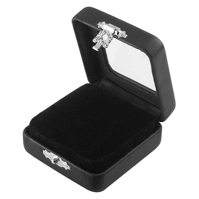تتميز علبة الأحجار الكريمة ذات المفصلة هذه بغطاء زجاجي شفاف يسمح برؤية واضحة لمحتوياتها ويثبت الحجر الكريم بأمان للعرض أو للمشاهدة باليد. يغطي العلبة البلاستيكية جلد صناعي أسود. تحتوي العلبة على إغلاق ومفصلات من الفولاذ؛ ووسادة رغوية قابلة للعكس — سوداء أو بيضاء — تحمي الحجر وتتيح لك اختيار اللون الذي يبرز الحجر بأفضل شكل. مساحة العرض تقيس 2-1/2" × 1-3/4".