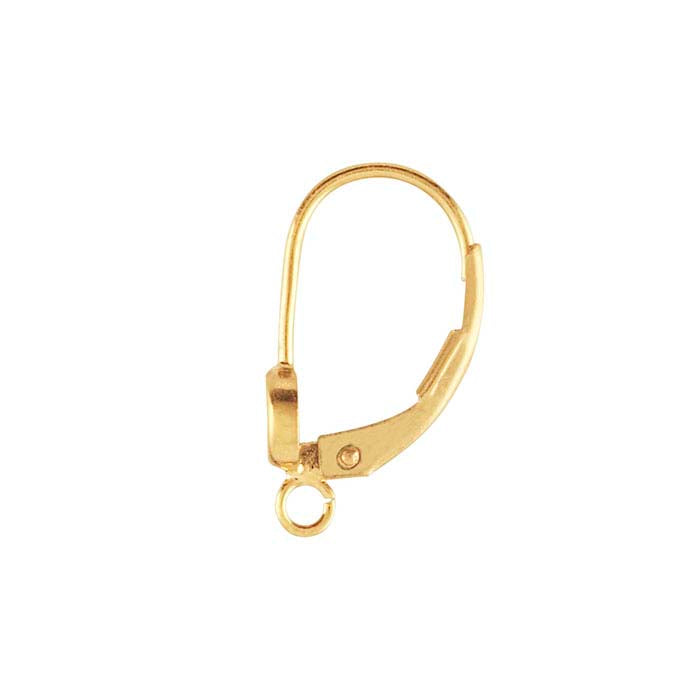 This 14/20 yellow gold-filled lever-back ear wire is back-set with a single 4mm round white CZ and features an open ring for attaching drops or dangles. The hinged closure helps protect against loss. A short length of open channel perfectly sized to accommodate the wire. Simply insert the wire and close the lever over it to secure the earring in place. This ear wire is plated with 14-karat yellow gold to ensure a uniform color.