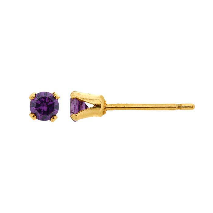 This 14/20 yellow gold-filled post earring features a Snap-Set™ mounting set with one 3mm round purple CZ, offering an economical alternative to natural amethyst, the birthstone for February. The friction post features a groove that helps provide the most secure and comfortable fit; post earrings require an ear nut to keep the post in place.