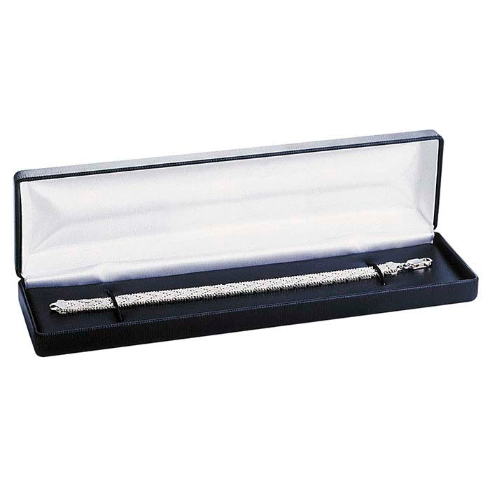 مغطى بجلد صناعي ناعم، هذا الصندوق المفصلي للأساور مثالي لتغليف أو عرض أي نوع من الأساور أو الساعات. أضف شريطًا زخرفيًا، تغليف هدايا أو فيونكة (متوفرة بشكل منفصل) لتخصيص الصندوق. يغطي الجلد الصناعي الأسود صندوقًا معدنيًا مبطنًا من الساتان الأبيض يغطي المفصلة؛ يتضمن الإدخال من الجلد الصناعي بنفس اللون أشرطة مطاطية لتثبيت المجوهرات. يُسلم في عبوة من قطعتين. اطبع اسم شركتك أو شعارها على صندوق الهدية بطباعة ساخنة، مما يبقيك في ذهن العميل لفترة طويلة بعد بيع المجوهرات.