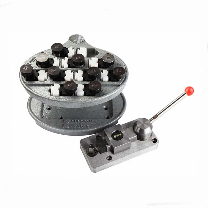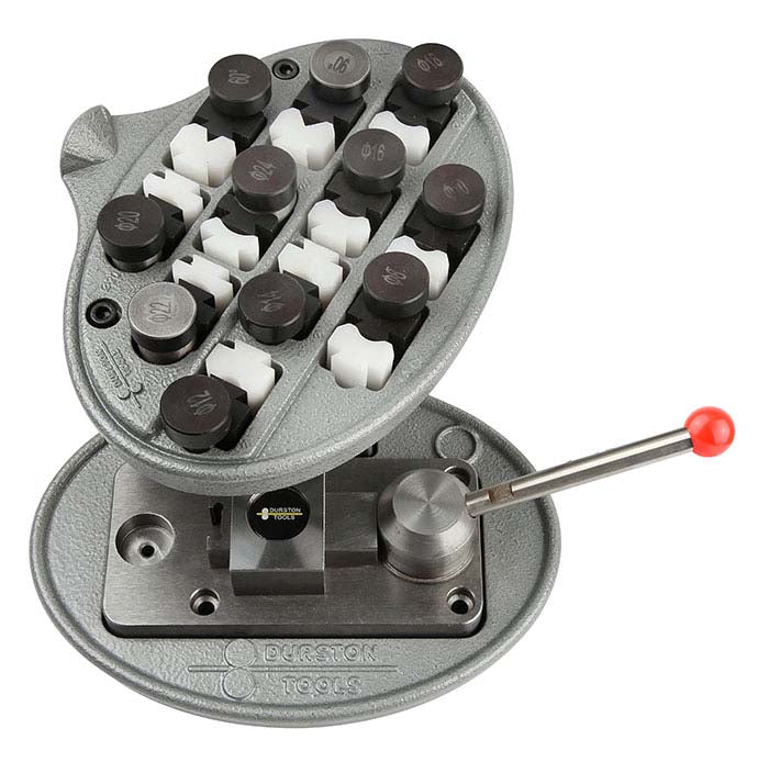 تم بناء هذا الطقم باستخدام تصميم Durston الحائز على جوائز وخبرة هندسية، مما يتيح لك بسهولة إنشاء منحنيات وزوايا في مقاسات الخواتم أو شرائط المعدن بسماكة تصل إلى 2 مم (0.078"). يوفر أداة الثني 11 زوجًا من قوالب الفولاذ المشكّلة وقوالب Delrin® غير المسببة للخدش، والتي تُخزن في صينية مرتفعة معنونة تقع فوق المثني على عمود دوار مرفق. كل قالب فولاذي للأداة مقسى إلى 52 HRC ومصقول بدقة لتقليل خدوش أسطح المعدن. تتأرجح الصينية بسهولة بعيدًا تمامًا أثناء الاستخدام. إذا رغبت، يمكن تثبيت المثني بشكل دائم على منضدتك باستخدام الفتحات المصبوبة بشكل ملائم في القاعدة (الأدوات غير مشمولة). يشمل هذا الطقم 20 قالبًا: