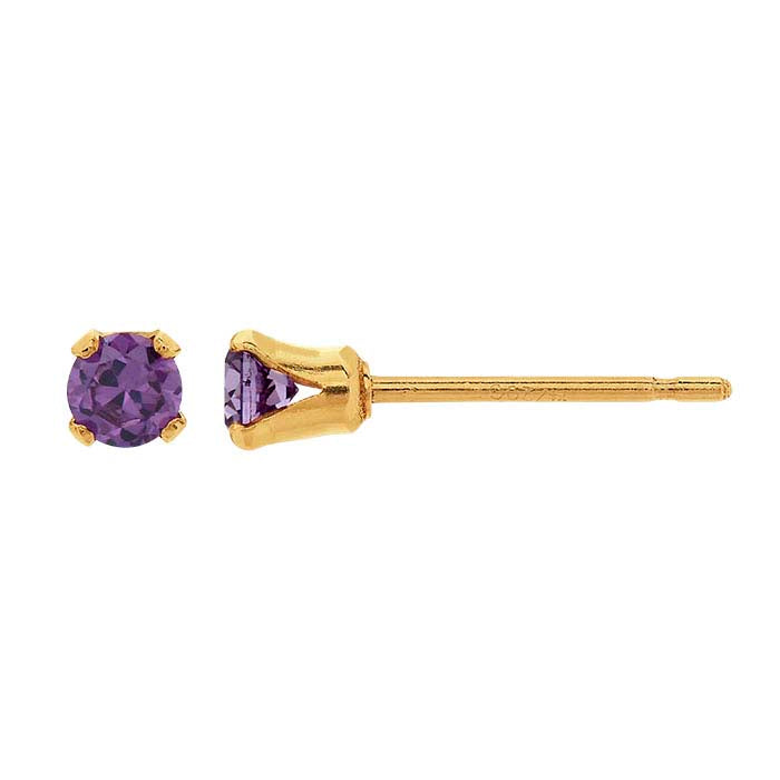 This 14/20 yellow gold-filled post earring features a Snap-Set™ mounting set with one 3mm round purple CZ, offering an economical alternative to natural alexandrite, the birthstone for June,. The friction post features a groove that helps provide the most secure and comfortable fit; post earrings require an ear nut to keep the post in place.