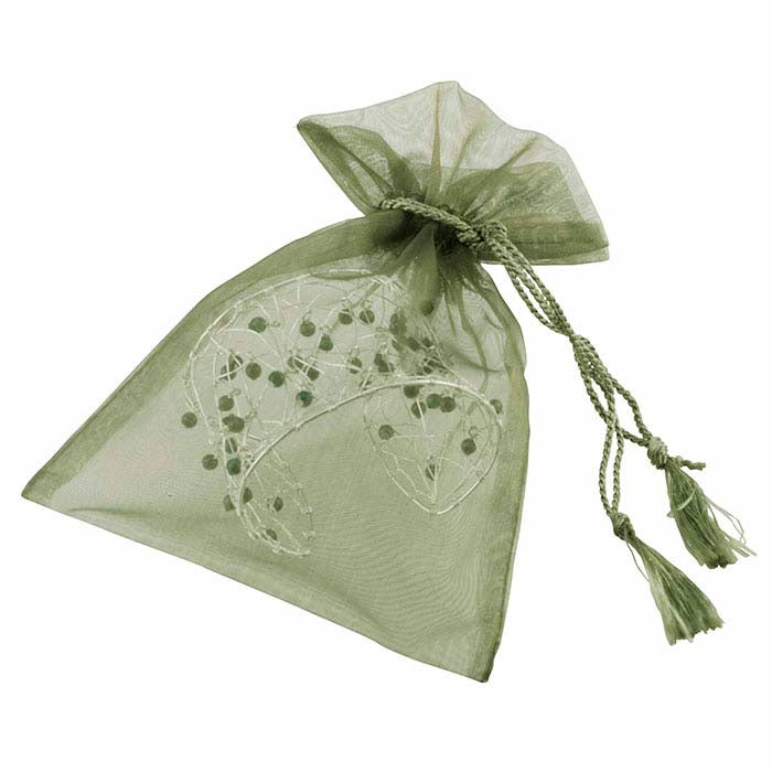 نسيج الأورجانزا الشفاف لهذا الكيس يسمح برؤية المجوهرات داخل الكيس لتقديم أنيق لتصاميم مجوهراتك. تستوعب الأكياس معظم أنواع المجوهرات، وتناسب المجوهرات على بطاقات مجوهرات بالحجم المناسب، وهي مثالية بشكل خاص للقطع ذات الأشكال غير المعتادة. إذا رغبت، يناسب الكيس بشكل جميل داخل صندوق هدايا مملوء بالقطن لتغليف هدايا سهل. الأكياس هي خيار تغليف هدية داخل هدية؛ بعد أن يقدم عميلك الهدية لمتلقيها، يكون الكيس مثالياً لحفظ التذكارات والكنوز الصغيرة - "هدية" ثانية يقدرها العملاء. هذا الكيس من الأورجانزا بنسبة 100% بلون أخضر الصفصاف يتميز بأشرطة ساتان ملتوية بنفس لون الكيس مع شرابات.