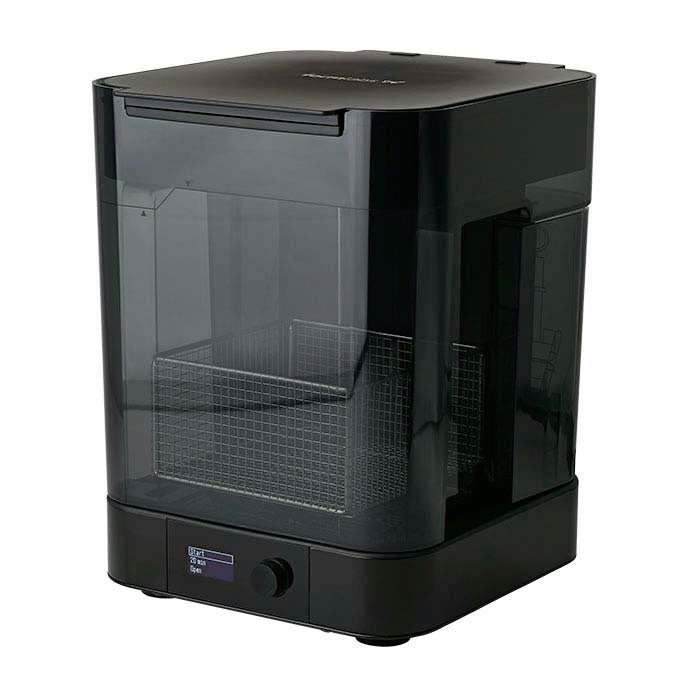 Efter opbygningen skal du rengøre dine lysfølsomme 3D-resinmodeller grundigt og effektivt ved hjælp af formlabs Form Wash-systemet. Form Wash-enheden har en tank stor nok til at rumme den maksimale volumen af din Form 2 eller Form 3 3D-printer. Hele basen glider på en holder med modellen stadig på plads, eller delen (eller delene) kan fjernes og placeres i trådkurven. En automatisk platform sænker resinstykket (eller stykkerne) ned i et bad af isopropylalkohol (IPA; ikke inkluderet), og en lille, kraftfuld turbine i bunden skaber en hvirvlende strøm, der rengør alle overflader på alle dele. Når vasken er færdig, løfter platformen automatisk delene op af tanken, hvilket undgår overvædede, deformerede dele. Delene tørrer hurtigt i luften og er derefter klar til produktion. Form Wash-enheden inkluderer en digital timer til at styre vaske-cyklussen, et specialtilpasset hydrometer, der overvåger alkoholmætning, en sifonpumpe, der gør det nemt at tømme og udskifte IPA efter behov, samt en indbygget opbevaringsbakke til praktisk opbevaring af efterbehandlingsværktøj.