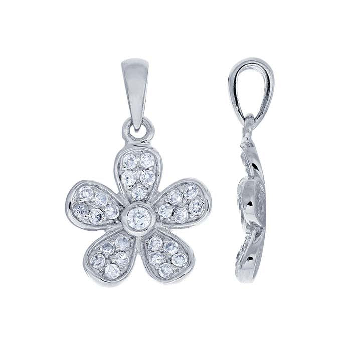 Ideal für Ihre individuellen Designs: Dieser Sterlingsilber-Anhänger zeigt eine fünfblättrige Blume und ist mit mehreren runden weißen Zirkoniasteinen besetzt. Der Anhänger wirkt sowohl allein als auch in Kombination mit anderen Anhängern und Komponenten hervorragend. Eine Rhodiumbeschichtung sorgt für ein langlebiges, anlaufbeständiges Finish. Dieser Anhänger verfügt über eine konische Öse.