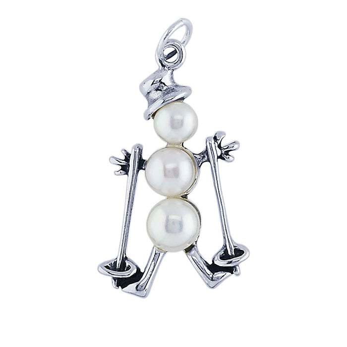 Dieser Anhänger aus Sterlingsilber zeigt einen Skifahrer-Schneemann mit einem Körper aus drei weißen Süßwasser-Zuchtperlen und ist mit einem Hut und Skistöcken verziert. Ideal für saisonale Designs, sieht der Anhänger allein großartig aus und lässt sich gut mit einer Auswahl an Charms und Perlen in Halsketten- und Armbanddesigns kombinieren. Ein Sprungring ist enthalten.