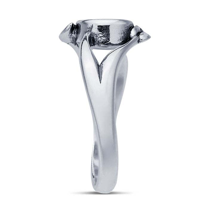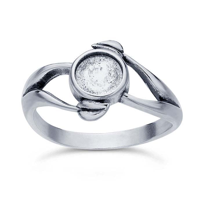 Diese Sterlingsilber-Ringfassung verfügt über einen gebogenen geteilten Schaft mit einem filigranen Blattdesign; die zentrale Zargenfassung hält einen 6 mm runden Cabochon. Die sich verjüngenden Enden des geteilten Schafts erinnern an Baumzweige und scheinen sich zu umschlingen, um die Fassung zu halten. Verwenden Sie Juwelier-Epoxidharz, um den Stein in der Fassung zu sichern.