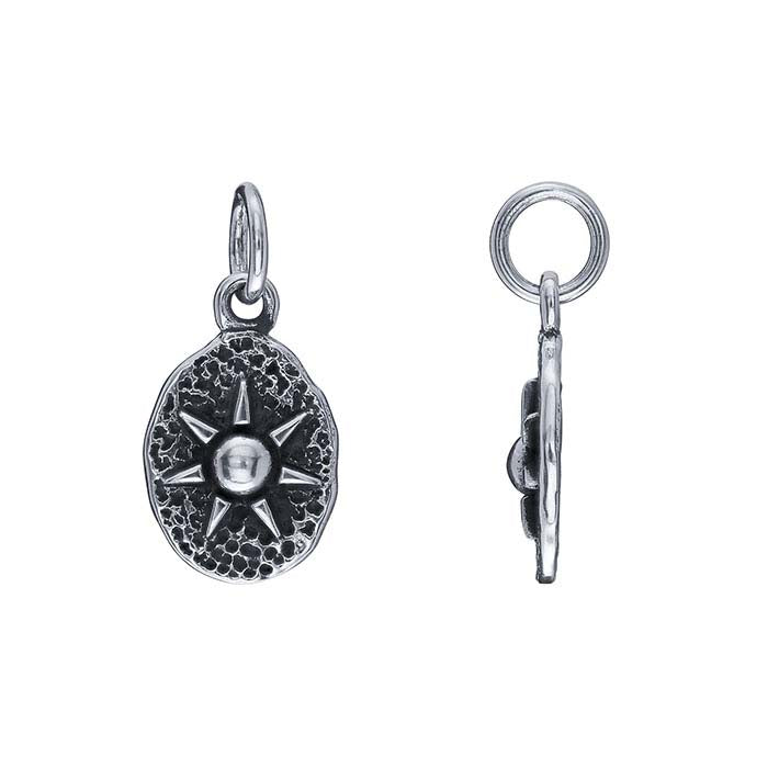 Dieser Sterlingsilber-Anhänger hat eine ovale Form und eine sonnige, glänzend polierte Oberfläche. Der Hintergrund ist uneben und unregelmäßig, wodurch der Anhänger als Anhänger oder in Kombination mit anderen alt aussehenden Anhängern und Komponenten in Halsketten- und Armbanddesigns hervorragend wirkt. Ein Sprungring ist enthalten.