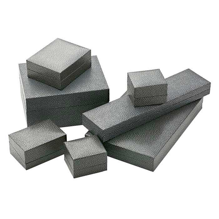 Diese elegante und stark strukturierte Geschenkbox, bezogen mit Lederimitat, fasst einen Ring. Das Lederimitat ist ein strapazierfähiges, künstliches Material, das die genoppte Oberfläche des typischen Stachelrochenleders imitiert; das charakteristische granulare Muster des Stachelrochens, flach geschliffen, um die hellere, innere Farbe der Körner zu zeigen, vermittelt ein attraktives, luxuriöses Aussehen und Gefühl, ideal zur Präsentation jedes Schmuckstücks. In Grau gefärbt, bedeckt das robuste, strukturierte Material eine Holzbox mit Scharnier; das Innere der Box ist mit einem dunkel schiefergrauen, weichen Wildledermaterial ausgekleidet, das das Scharnier bedeckt und das Innere der Box auskleidet. Der Einsatz verfügt über einen gepolsterten Schlitz, der verschiedene Ringstile hält, einschließlich Herren- und Siegelringe. Seit Jahrhunderten als "Shagreen" bekannt, sind die Texturen dieser exotischen Lederarten beliebt und sehr gefragt für hochwertige Luxus-Akzent- und Accessoire-Artikel. Echtes Shagreen, hergestellt aus ungerbtem Stachelrochen-, Hai- oder anderem Knorpelhautleder, das mit zahlreichen knöchernen Dentikeln bedeckt ist, zeigt die schöne, genoppte Textur, die in dem proprietären, umweltfreundlichen Lederimitatmaterial, das diese Schachtel bedeckt, nachgebildet wurde. Diese Schachtel wird in einem zweiteiligen Kartonverpacker geliefert. Prägen Sie den Kartonverpacker mit Ihrem Firmennamen oder Logo, um auch lange nach dem Schmuckverkauf in Erinnerung zu bleiben. Fügen Sie ein dekoratives Band, Geschenkpapier oder eine Schleife (separat erhältlich) hinzu, um die Schachtel individuell zu gestalten.