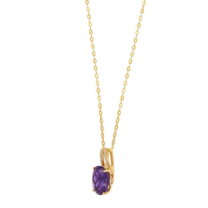 This finished 10-karat yellow gold necklace is set with one 10 x 8mm oval amethyst faceted gemstone. The bail is set with several round white diamonds (I3 clarity/I–J color; 0.035CTTW). A spring ring clasp completes the necklace.