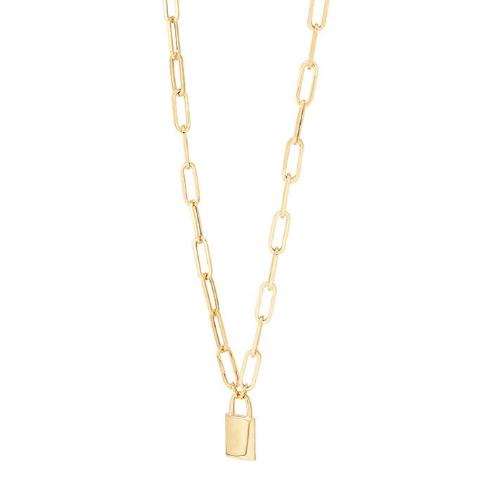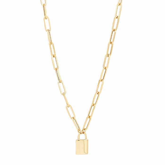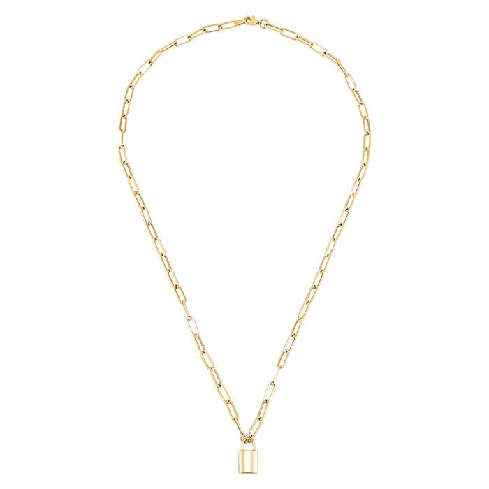 This finished 10-karat yellow gold necklace features a lock pendant with a polished finish on a 3.8mm paperclip chain. A lobster clasp completes the necklace.