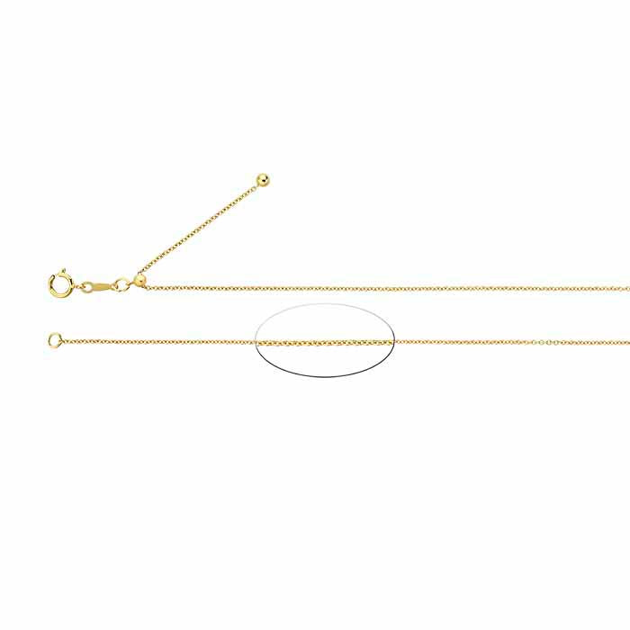 Αυτή η οβάλ αλυσίδα καλωδίου από κίτρινο χρυσό 14/20 είναι το τέλειο φόντο για ευαίσθητα σχέδια. Προσφέρετέ την όπως είναι ή προσθέστε μικρά γούρια, σταγόνες ή κρεμαστά για μια προσαρμοσμένη εμφάνιση. Το κούμπωμα διαθέτει χάντρα με επένδυση σιλικόνης που παραμένει στη θέση της στην αλυσίδα, αλλά επιτρέπει στους πελάτες να σύρουν την αλυσίδα μέσα από τη χάντρα για να ρυθμίσουν το μήκος της αλυσίδας έως και 22". Αυτή η αλυσίδα είναι επιχρυσωμένη με 14 καράτια κίτρινο χρυσό για να εξασφαλίσει ομοιόμορφο χρώμα. Το πιο κοινό στυλ αλυσίδας, οι αλυσίδες καλωδίου σχηματίζονται απλά συνδέοντας μεμονωμένους κρίκους κάθετα άκρο με άκρο. Οι κρίκοι μπορεί να είναι στρογγυλοί, οβάλ ή άλλων σχημάτων — οι κρίκοι αυτής της αλυσίδας είναι οβάλ.