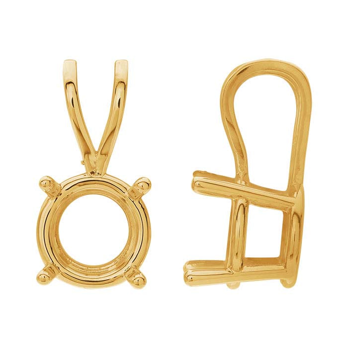 Αυτό το μενταγιόν από 14 καράτια κίτρινο χρυσό διαθέτει κλασική στρογγυλή στεφάνη τύπου καλάθι με κρεμαστή σε σχήμα αυτιού κουνελιού. Η στεφάνη με 4 νύχια κρατά έναν στρογγυλό 9mm πολύεδρο λίθο. Οι βάσεις τύπου καλάθι έχουν ανοιχτές πλευρές σχεδιασμένες να επιτρέπουν περισσότερο φως να φτάνει και να διαπερνά τον λίθο, ενισχύοντας τη φωτεινότητα και τη λάμψη του. Η κρεμαστή σε σχήμα αυτιού κουνελιού είναι ένα κωνικό στυλ που χωρίζεται κάθετα στη μέση, δίνοντάς της την εμφάνιση ενός ζεύγους μακριών, καμπυλωτών αυτιών κουνελιού. Τοποθετήστε το καμέο, το καμποσόν ή τον πολύεδρο λίθο στη στεφάνη και στη συνέχεια γυαλίστε τα νύχια πάνω στον λίθο για να τον ασφαλίσετε στη θέση του· κόψτε μια θέση σε κάθε νύχι αν χρειάζεται.