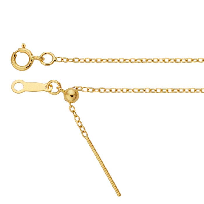 Αυτό το κολιέ με αλυσίδα καλωδίου 14 καρατίων από κίτρινο χρυσό με ρυθμιζόμενο μήκος διαθέτει σχεδιασμό που καθιστά εύκολη την προσθήκη γοητειών, μενταγιόν ή χαντρών στην αλυσίδα, δημιουργώντας ένα ευέλικτο, ατελείωτα προσαρμόσιμο κομμάτι κοσμήματος για τους πελάτες σας. Το άκρο της αλυσίδας τελειώνει με έναν στρογγυλό πείρο (0,025"), περάστε τον πείρο μέσα από τις χάντρες ή τα εξαρτήματά σας για να δημιουργήσετε το σχέδιο, και στη συνέχεια μέσα από το κούμπωμα ολισθητήρα με χάντρα. Η στρογγυλή χάντρα κούμπωμα ολισθητήρα 3mm έχει επένδυση σιλικόνης που ασφαλίζει τα στοιχεία του σχεδίου σας στην αλυσίδα και επίσης επιτρέπει στους πελάτες σας να ρυθμίζουν το μήκος της αλυσίδας από σχεδόν 0" έως μέγιστο μήκος 18".