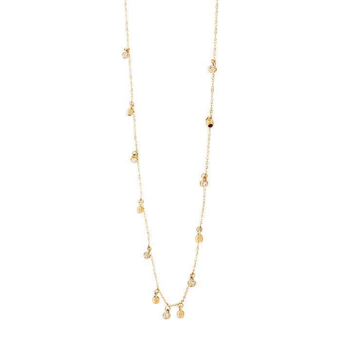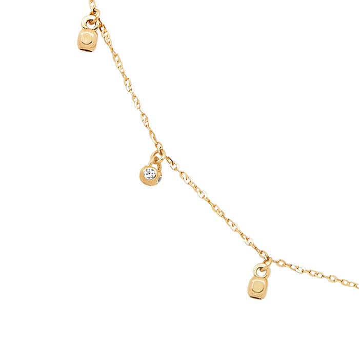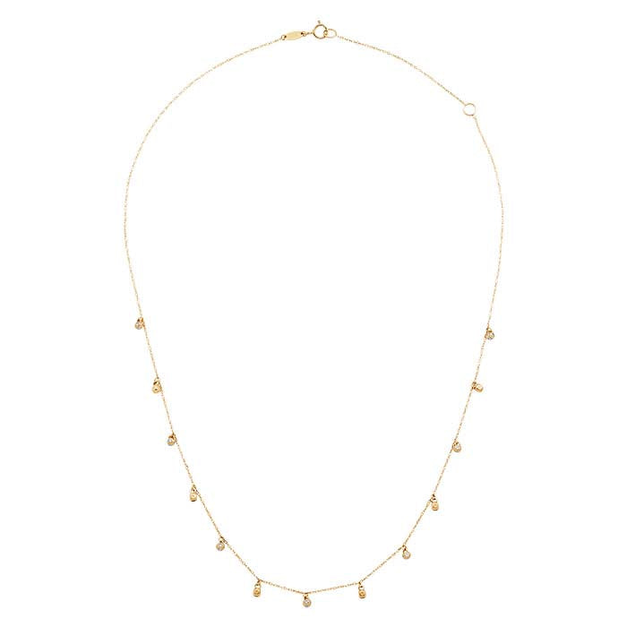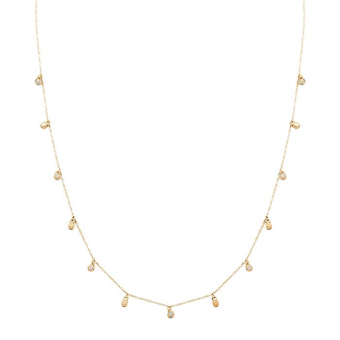 Αυτό το ολοκληρωμένο κολιέ από κίτρινο χρυσό 14 καρατίων διαθέτει αρκετά φυλαχτά, το καθένα με ένα στρογγυλό λευκό CZ. Το κολιέ ολοκληρώνεται με κούμπωμα ελατηρίου.