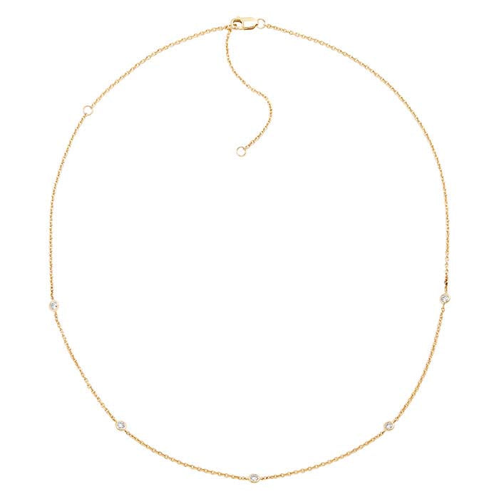 Αυτό το ολοκληρωμένο κολιέ από κίτρινο χρυσό 14 καρατίων διαθέτει πέντε σημεία, καθένα από τα οποία είναι σε πλαίσιο με ένα στρογγυλό λευκό διαμάντι (καθαρότητα I2/χρώμα G–H; 1/4CTTW) σε αλυσίδα καλωδίου. Το κολιέ έχει κρίκο σε 14" και 16" για ρυθμιζόμενο μήκος και ολοκληρώνεται με κούμπωμα τύπου lobster.