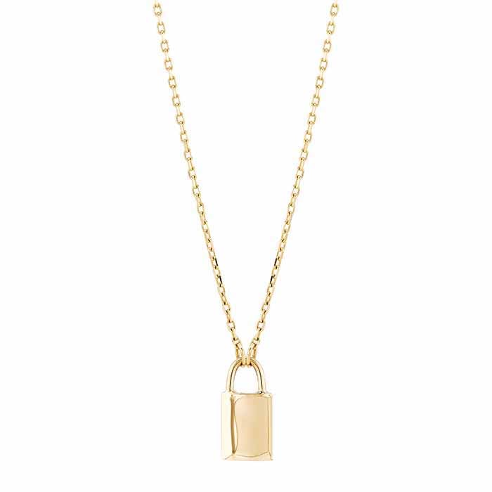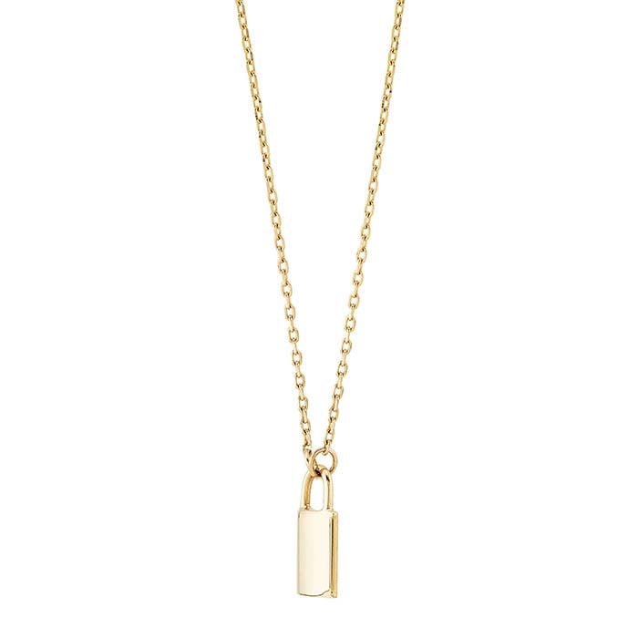 Αυτό το ολοκληρωμένο κολιέ από κίτρινο χρυσό 14 καρατίων διαθέτει ένα μικρό μενταγιόν σε σχήμα κλειδαριάς με γυαλιστερό φινίρισμα. Το κολιέ έχει κρίκο σύνδεσης στα 16" και 17" για ρυθμιζόμενο μήκος και ένα ελατήριο-δαχτυλίδι ολοκληρώνει το κολιέ.
