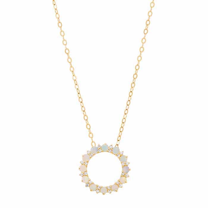 Αυτό το ολοκληρωμένο κολιέ από κίτρινο χρυσό 14 καρατίων διαθέτει ένα κυκλικό μενταγιόν που είναι διακοσμημένο με 2mm στρογγυλά λευκά όπαλ και 1mm εργαστηριακά καλλιεργημένους λευκούς ζαφείρους με όψη. Το μενταγιόν είναι περασμένο σε αλυσίδα καλωδίου και ένα κούμπωμα αστακού ολοκληρώνει το κολιέ.