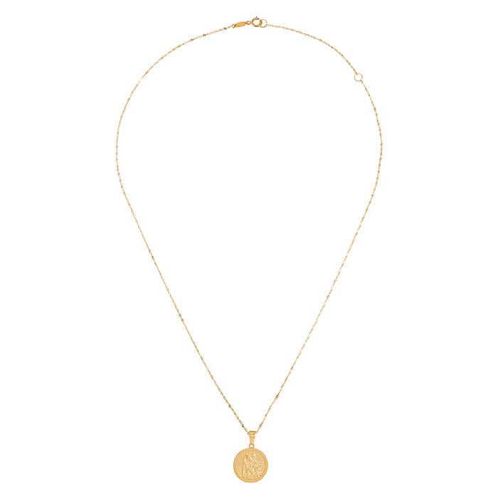 Αυτό το ολοκληρωμένο κολιέ από κίτρινο χρυσό 14 καρατίων διαθέτει ένα μενταγιόν χαραγμένο με τον Άγιο Χριστόφορο, σύμβολο προστασίας για τους ταξιδιώτες στα ταξίδια τους. Το κολιέ έχει προέκταση 2" για ρυθμιζόμενο μήκος και ολοκληρώνεται με κούμπωμα τύπου ελατηρίου.