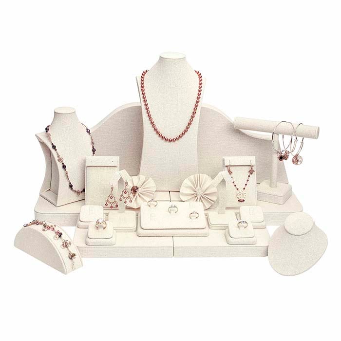 Αυτό το σετ προβολής διαθέτει μια βάση οκτώ τεμαχίων που μπορεί να διαταχθεί ως μία ενιαία μονάδα ή να διαταχθεί ως ξεχωριστές σκηνές για να δημιουργήσει μια μεγάλη ποικιλία παρουσιάσεων για τη σειρά κοσμημάτων σας. Μπεζ λινό καλύπτει επενδεδυμένες ξύλινες και χαρτονένιες φόρμες σε αυτό το σετ προβολής 24 τεμαχίων.
