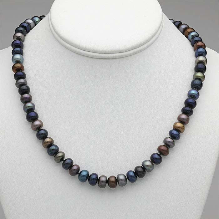 Αυτό το τελειωμένο κολιέ με μαργαριτάρια διαθέτει καλλιεργημένα μαργαριτάρια 9–10mm σε ποικιλία χρωμάτων. Είναι τελειωμένο με κούμπωμα από ασήμι sterling με απελευθέρωση push που είναι επιχρυσωμένο με ρόδιο.