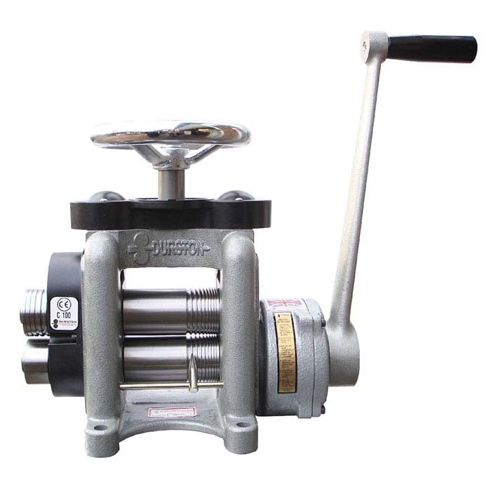 Built with Durston’s award-winning design and engineering expertise, this Durston DRM C100RE rolling mill easily rolls sheet, square wire, and half-round wire to the precise gauge you need for your metal-forming work. Versatile Rolling This combination rolling mill offers a 64mm (2.5”) flat area, nine square grooves, and extension rollers with four “D” grooves. The grooves are ideal for creating and drawing out square or half round wire, while the flat area gradually reduces metal thickness. You can also use pattern plates in the flat area to emboss sheet for more detailed and complex designs. DRM Quality Durston is the foremost manufacturer of rolling mills throughout the world; they are recognized for reliability and robust construction with high-quality metal gears and rollers for a lifetime of service. This Durston DRM C100RE mill features a precisely calibrated wheel at the top that allows you to easily adjust the mill. The body is cast iron for ultimate strength.
