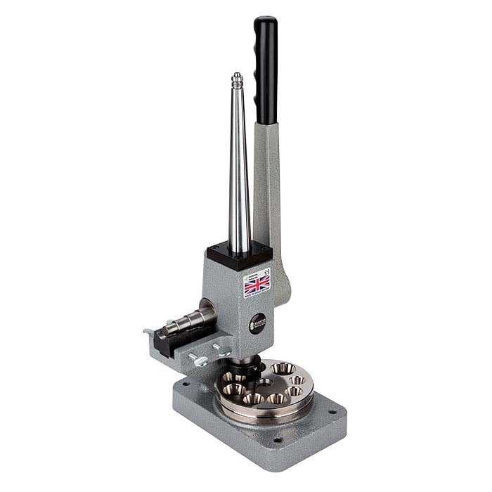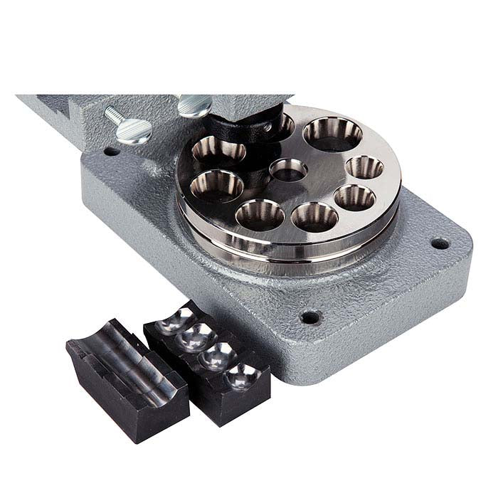 Κατασκευασμένο με το βραβευμένο σχέδιο και την τεχνογνωσία μηχανικής της Durston, αυτός ο μετρητής δαχτυλιδιών σας επιτρέπει να τεντώνετε και να μειώνετε εύκολα δαχτυλίδια και μπάντες έως το μέγεθος 14 (Η.Π.Α.). Μια ειδικά σχεδιασμένη μείωση γραναζιών εξασφαλίζει αβίαστη διαμόρφωση και καθιστά τον τεντωτή ιδανικό για κάμψη και διαμόρφωση δαχτυλιδιών χρησιμοποιώντας ημικυκλικό, επίπεδο, οβάλ υλικό δαχτυλιδιών πάχους έως 4mm (0.157”). Ο μετρητής δαχτυλιδιών διαθέτει έξι αυλακώσεις στον γυαλισμένο ατσάλινο άξονα, εξασφαλίζοντας εξαιρετικά ακριβή μέτρηση δαχτυλιδιών. Δεκαέξι βυθισμένα καλούπια στην γυαλισμένη ατσάλινη πλάκα μείωσης μειώνουν τις μπάντες έως 12mm πλάτος. Περιλαμβάνονται δύο καλούπια κάμψης δαχτυλιδιών για επίπεδο και κυρτό υλικό. Το σώμα είναι από χυτοσίδηρο, με επίστρωση πούδρας για μακροχρόνια αντοχή, και η βάση έχει τέσσερις τρύπες βυθισμένες διαμέτρου 7.5mm (0.29”) για ασφαλή στερέωση στην επιφάνεια εργασίας σας (τα εξαρτήματα στερέωσης δεν περιλαμβάνονται).