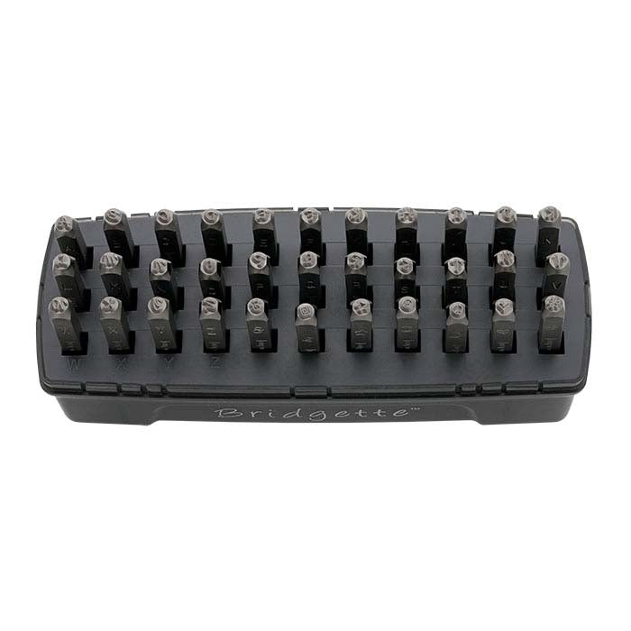 Quickly add decorative lettering or custom phrases to your jewelry designs with this ImpressArt® alphabet design stamp set. These stamps have straight shanks and are perfect for marking flat surfaces such as quality or brand tags, discs, stampings and other components. Each stamp is labeled on its side for easy identification and orientation. This set includes the complete alphabet (A–Z) plus seven additional shapes and comes in a slotted case (6-3/4"W x 2-1/2"D x 3-1/4"H) with clear lid for easy, organized storage. ImpressArt® stamps are cut from hardened steel and tested for Rockwell hardness and perfect alignment. They are great for stamping soft metals including brass, copper, nickel silver, gold, silver and aluminum. Stamps with a straight shank have a flat tip face that's perpendicular to the tool shank. Designed to work perfectly with the specially made Ergo-Angle™ stamping hammer and Simple Strike Jig™ (each available separately), these stamps are durable, providing consistent metal-stamping success when creating custom, personalized jewelry items. For best results—and because any stamped mark is not easy to remove once it's made—it's important to practice before attempting to mark your jewelry designs. Scrap pieces of sheet or flat base metal components are ideal for helping you get the feel of both the stamp and the power needed for an effective hammer strike. Use a brass mallet to strike the stamp to help prevent damage to your stamp, and support your workpiece on a bench block or an anvil. Finally, do your stamping before setting stones so that there is no risk of damaging settings or loosening set stones.