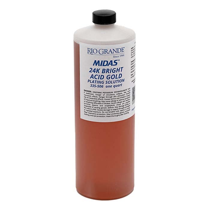 Επιχρίστε απευθείας πάνω σε νικέλιο, πλατίνα ή χρυσό με αυτή τη Midas® οξινοβάση 24 καρατίων κίτρινη λαμπερή χρυσή επίστρωση για να αποθέσετε πλούσιο χρώμα 24 καρατίων κίτρινου χρυσού. Αυτή η λύση πλήρους ισχύος λειτουργεί σε χαμηλότερη θερμοκρασία και είναι πιο ασφαλής στη χρήση από τις χρυσο-λύσεις με κυανιούχο. Δεν απαιτείται προετοιμασία· απλώς ρίξτε τη λύση στη δεξαμενή θέρμανσης και ξεκινήστε την επίστρωση μόλις η λύση φτάσει στη θερμοκρασία. Ιδανικά, χρησιμοποιήστε με πλατινιζμένο τιτανίου άνοδο.