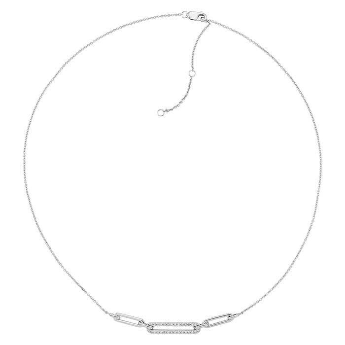 This finished sterling silver necklace features a three-link festoon pendant; the center link is set with 30 round white diamonds (I3 clarity/H–I color; 0.09CTTW). The pendant is suspended between two lengths of cable chain; the necklace has a 2" extender for adjustable length and is completed with a lobster clasp. This necklace has a ".925" sterling silver stamp as a symbol of guaranteed product quality.