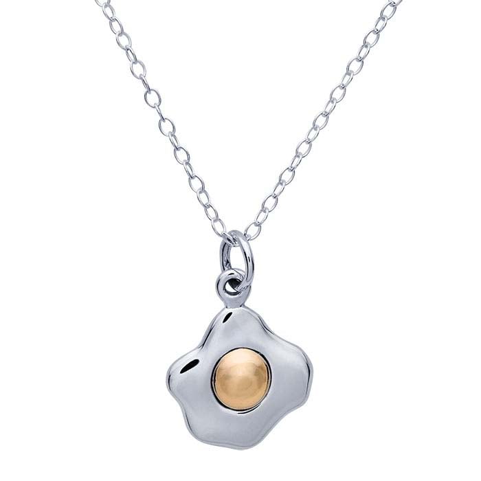 This finished sterling silver necklace features a fried egg with bronzed yolk pendant that is oxidized to highlight the details. The necklace is completed with a spring ring clasp. It has a ".925" sterling silver stamp as a symbol of guaranteed product quality.
