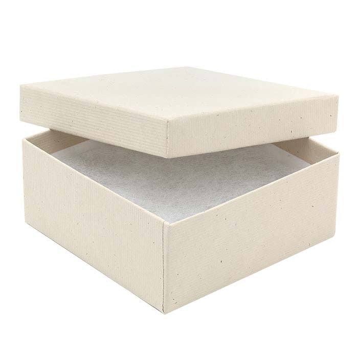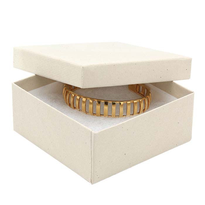 Αυτό το δίκομμα, καλυμμένο με χαρτί, καθολικό κουτί φιλοξενεί μια ποικιλία στυλ κοσμημάτων. Χρησιμοποιήστε το κουτί όπως είναι, ή συνδυάστε το με μονόχρωμα χαρτονένια κουτιά για να δημιουργήσετε χρωματικούς συνδυασμούς που ταιριάζουν στο brand σας, για εποχιακή συσκευασία ή για ειδικές περιστάσεις. Προσθέστε μια διακοσμητική κορδέλα, περιτύλιγμα δώρου ή φιόγκο (διατίθενται ξεχωριστά) για να προσαρμόσετε κάθε κουτί. Το ανακυκλωμένο χαρτί χρώματος σίτου (100% ίνες μετά την κατανάλωση) καλύπτει το 100% ανακυκλωμένο χαρτόνι (κατασκευασμένο με 90% ίνες μετά την κατανάλωση και 10% ίνες πριν την κατανάλωση). Το κουτί περιλαμβάνει επένδυση από λευκό πολυεστερικό υλικό πάχους 1/2" που δεν προκαλεί οξείδωση. Σφραγίστε θερμικά το κουτί δώρου σας με το όνομα ή το λογότυπο της εταιρείας σας, διατηρώντας σας στην κορυφή της μνήμης πολύ μετά την πώληση των κοσμημάτων.