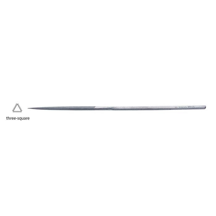 This Friedrich Dick three-square (triangle) escapement file is ideal for your most delicate filing and shaping tasks, for smoothing tiny details, and for creating inside cuts. Use this file for pre-polishing and finishing corners, edges, sharp angles and creases or folds. It is also useful for shaping the prongs on marquise- or pear-cut settings. The file has three flat sides of equal width that taper to a fine point. This file has a German cut #5; German-cut files are graded by the number of teeth, counting teeth parallel to the long axis of the file. German cuts start coarser than Swiss and go finer, offering more increments for more precise cutting. In all cut styles, the higher the number, the finer its cut. Escapement files are narrower and thinner than standard needle files with shorter cutting surfaces and longer, square handles. Effective on gold, silver, platinum, titanium, steel and other metals, escapement files are best suited for work that requires little metal removal. Among the finest jewelers' files in the world, Friedrich Dick files are made of tough chrome/tool steel alloy and precisely machined to yield sharp corners and fine points. These files have deep-cut teeth that provide efficient, uniform stock removal and are 66–67 HRC hardness for exceptional service with minimal care.