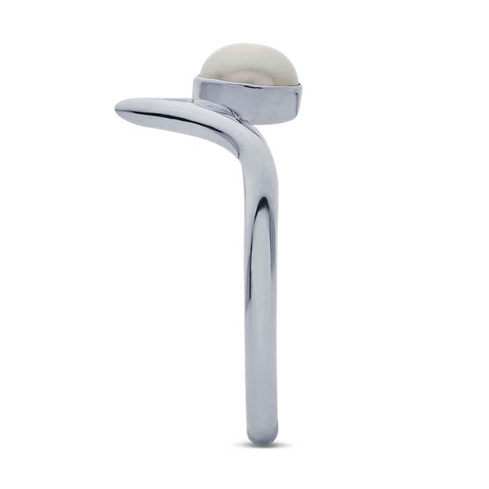 This finished sterling silver ring has a chevron design and is set with a round white freshwater cultured pearl. The ring stands alone as a simple accent piece and is also ideal offered among a wide selection of stackable rings that customers can choose from to create an individual, changeable look.