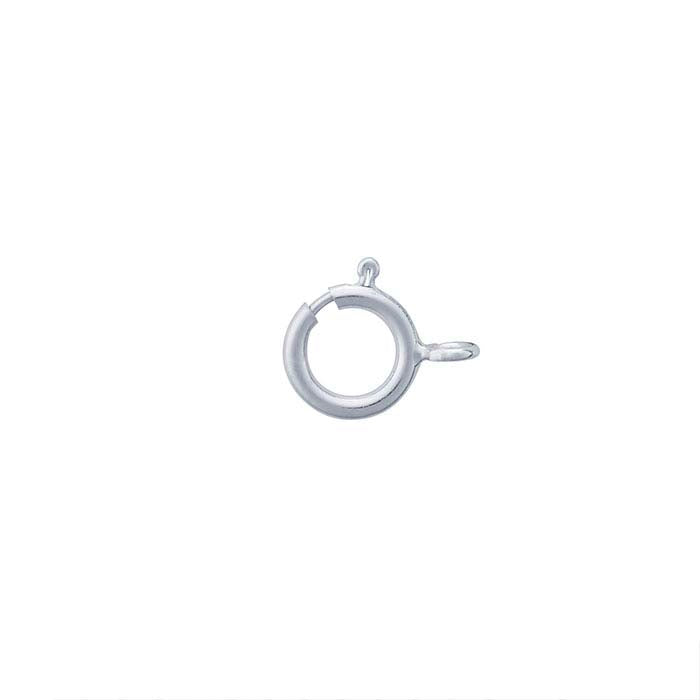 This 14-karat white gold spring ring clasp features an open ring, making it quick and easy to incorporate into your design. After attaching to your design, simply solder it closed to secure your design to the clasp. A classic clasp, the spring ring is ideal for all but the heaviest of necklaces. A spring ring is simply a hollow ring with an opening in one side that is closed off by a sliding 'door' inside the hollow ring. The door is held in place by a tiny spring controlled by a tiny nib on the outside of the ring. Press the nib back to compress the spring and open the clasp; release it to close the clasp. This clasp is plated with rhodium to ensure a durable, tarnish-resistant finish.