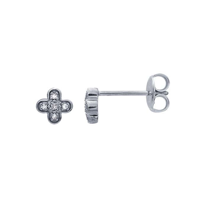 These finished 14-karat white gold earrings feature a rounded cross and are set with two 0.004-ct. and eight 0.0035-ct. round white diamonds (I1-I2 grade/H,I color; 0.036CTTW). The friction post offers two grooves, allowing customers to customize the fit of their earring; ear nuts are included.