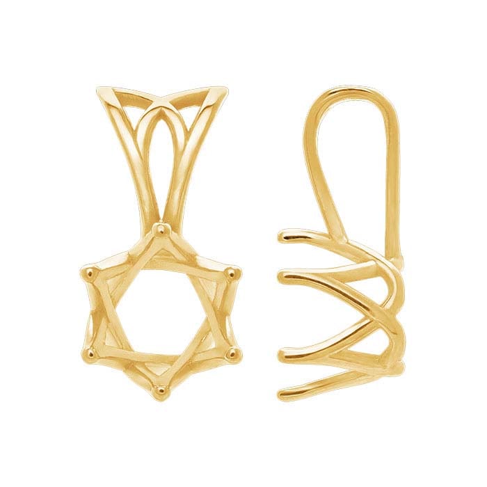 This 14-karat yellow gold pendant mounting features a swirl heart design at the base and holds one 7mm (1-1/4-ct., approx.) faceted gemstone in a 6-prong setting. It features a rabbit-ear bail—a tapered bail that’s split in half vertically, giving it the appearance of a pair of long, curving rabbit ears. The 6-prong setting offers extra security for large or high-value gemstones. Cut a seat in the prongs to accommodate your stone, then burnish the prongs over the stone to secure it in place. This pendant mounting is manufactured to exacting quality standards in our solar-powered facility.