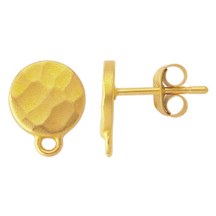 This 24-karat heavy yellow gold-plated sterling silver post earring features a round face with a beautiful hammered finish. Use the closed ring to attach a drop or dangle to complete the design. The friction post features a groove that helps secure the ear nut; ear nuts are included. Offer your customers both the beauty of 24-karat gold and the value of precious metal at a very affordable price. This satin-finish earring pair is made of sterling silver and heavily plated with a 1-micron thick layer of pure 24-karat gold—a far more substantial layer than traditional plating.