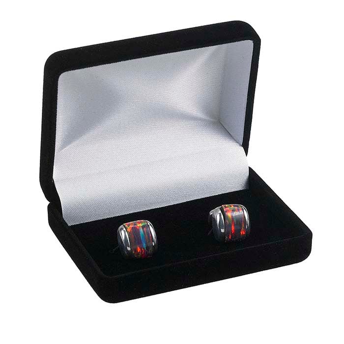 Covered with black velour, this hinged gift box is ideal for packaging or displaying a set of cufflinks. Add a decorative ribbon, gift wrapping or bow (available separately) to customize the box. Black velour covers the plastic box with a white satin lining that covers the hinge; matching-color velour covers the cardboard insert. Delivered in a one-piece packer.