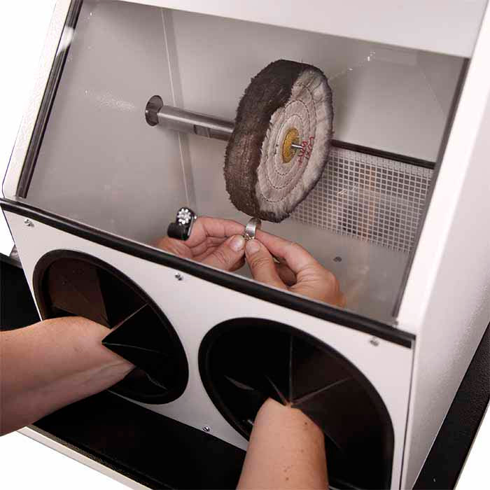 • Two "Super Flow" enclosed polishing hoods with interior light, 14"W x 15"D x 15-1/4"H (336008).