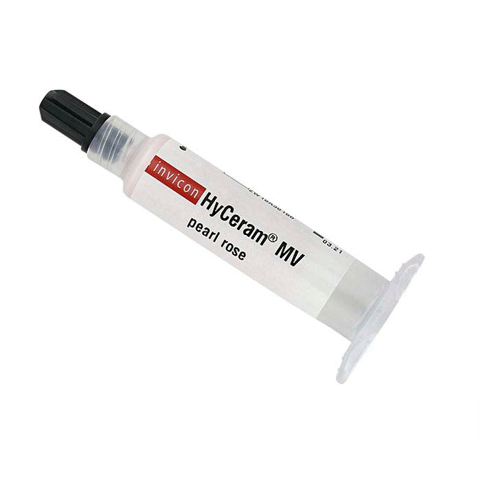HyCeram® is a hybrid ceramic and polymer material formulated and manufactured in Austria by Invicon; its viscosity can be adjusted somewhat to allow precision placement on both flat and domed surfaces—even into crevices and hollows. Choose medium viscosity (MV) for flat pieces, shallow domes or curves, and for covering or filling small crevices; choose high viscosity (HV) for round or domed pieces. Please check to ensure that you order the appropriate formula.