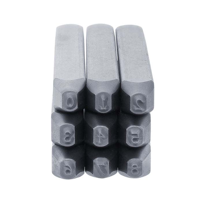 Quickly add decorative lettering or custom phrases to your jewelry designs with this ImpressArt® number design stamp set. These stamps have straight shanks and are perfect for marking flat surfaces such as quality or brand tags, discs, stampings and other components. Each stamp is labeled on its side for easy identification and orientation. This set includes numbers 0–8 (6 use for 9) and comes in a storage case with labeled slots for each stamp. ImpressArt® stamps are cut from hardened steel and tested for Rockwell hardness and perfect alignment. They are great for stamping soft metals including brass, copper, nickel silver, gold, silver and aluminum. Stamps with a straight shank have a flat tip face that's perpendicular to the tool shank. Designed to work perfectly with the specially made Ergo-Angle™ stamping hammer and Simple Strike Jig™ (each available separately), these stamps are durable, providing consistent metal-stamping success when creating custom, personalized jewelry items. For best results—and because any stamped mark is not easy to remove once it's made—it's important to practice before attempting to mark your jewelry designs. Scrap pieces of sheet or flat base metal components are ideal for helping you get the feel of both the stamp and the power needed for an effective hammer strike. Use a brass mallet to strike the stamp to help prevent damage to your stamp, and support your workpiece on a bench block or an anvil. Finally, do your stamping before setting stones so that there is no risk of damaging settings or loosening set stones.